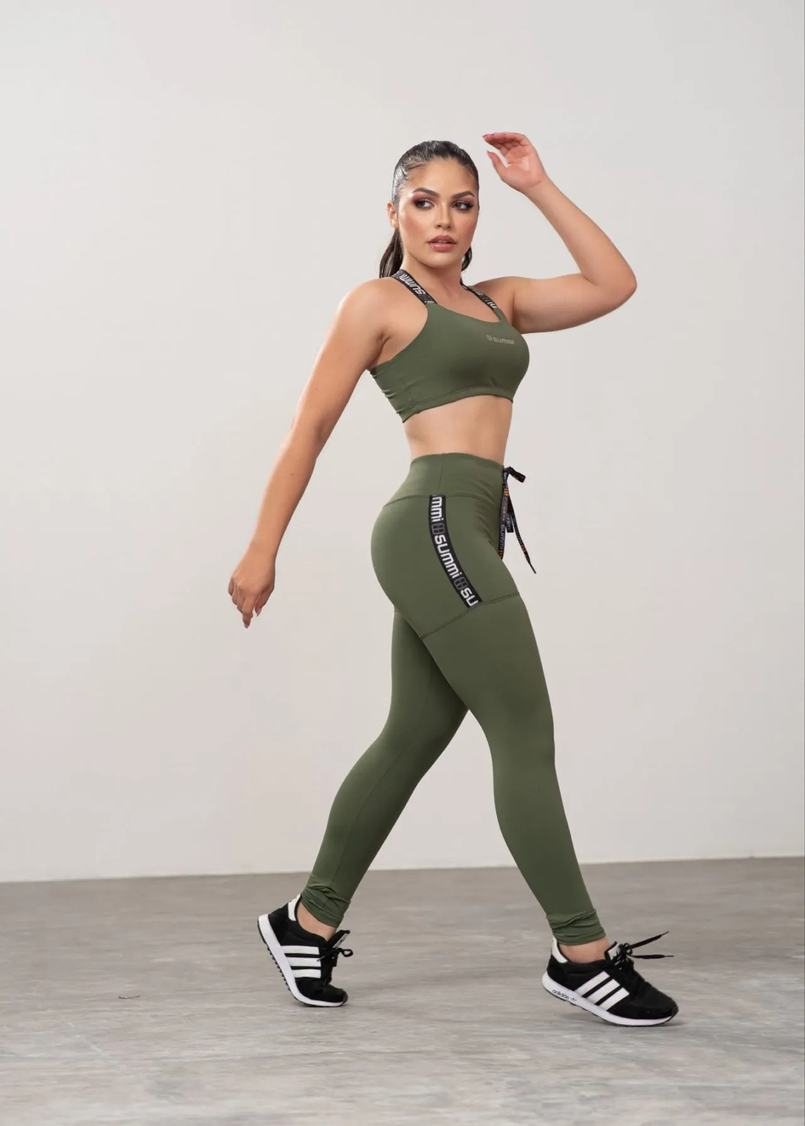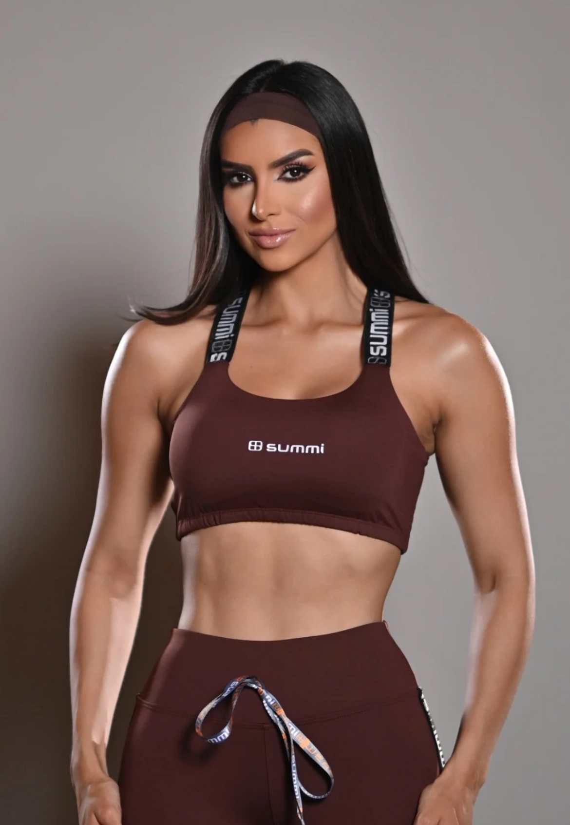 Top com bojo removível, tecido em poliamida alça de elástico preto é cruzado nas costas, escrito o nome SUMMI em branco.